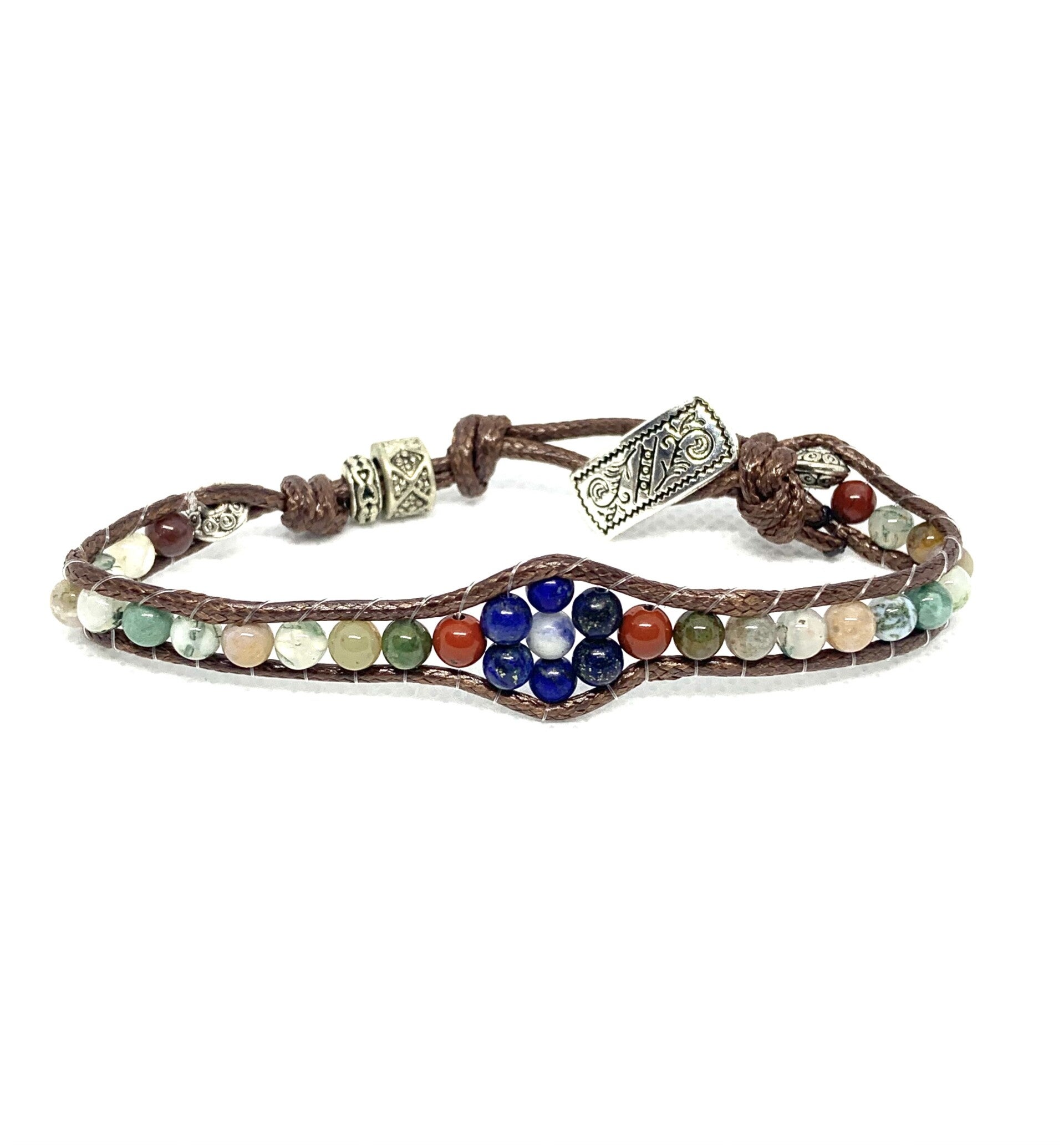 This bracelet is made with a Lapis Lazuli beaded flower and Indian Agate. Finished with silver endings and button