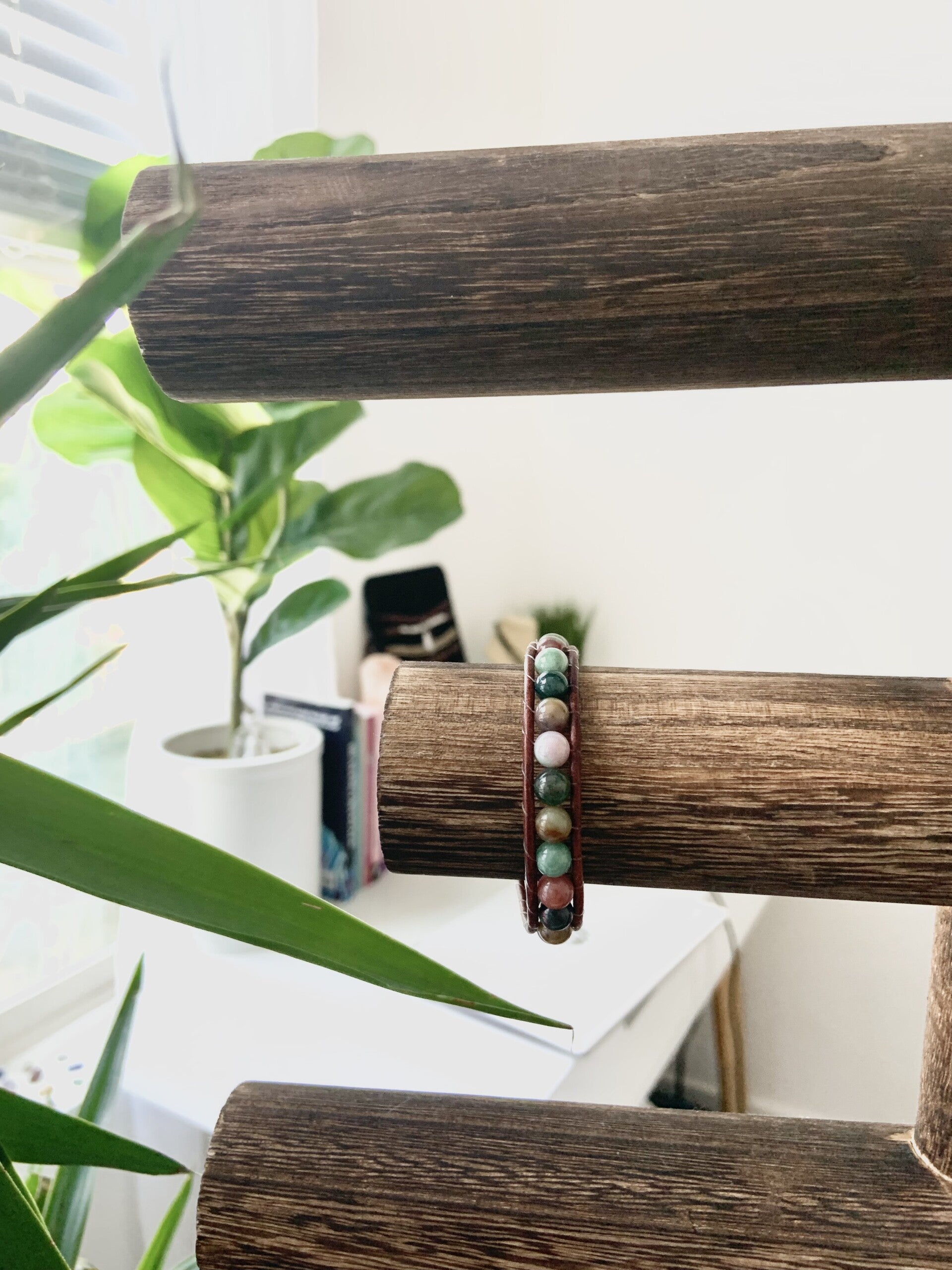 This leather bracelet is made with these lovely earth toned Indian Agate. It's healing energies include protection, strength, luck and peace