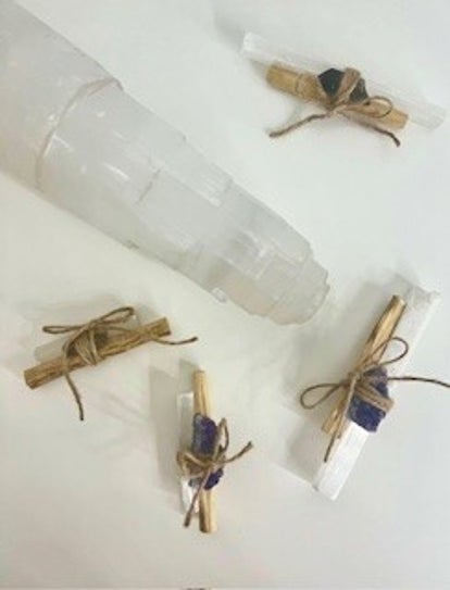 a selenite bundle combied with polo santo, amethyst and/or smokey quartz creates a powerful synergistic arrangement of energy-clearing and healing properties. Selenite cleanses and clears the energy field, while polo santo provides groumding influence, and amethyst offers deep spiritual insight and protection.